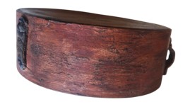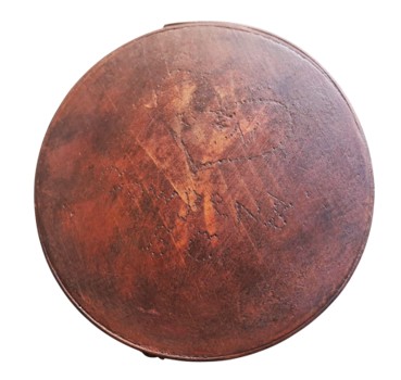 Painted Revolutionary War cheesebox with engraved heart and ‘Cowpens, SC’ on the face of the canteen which retains its three original leather strap keepers. 5 ¼” diameter.
